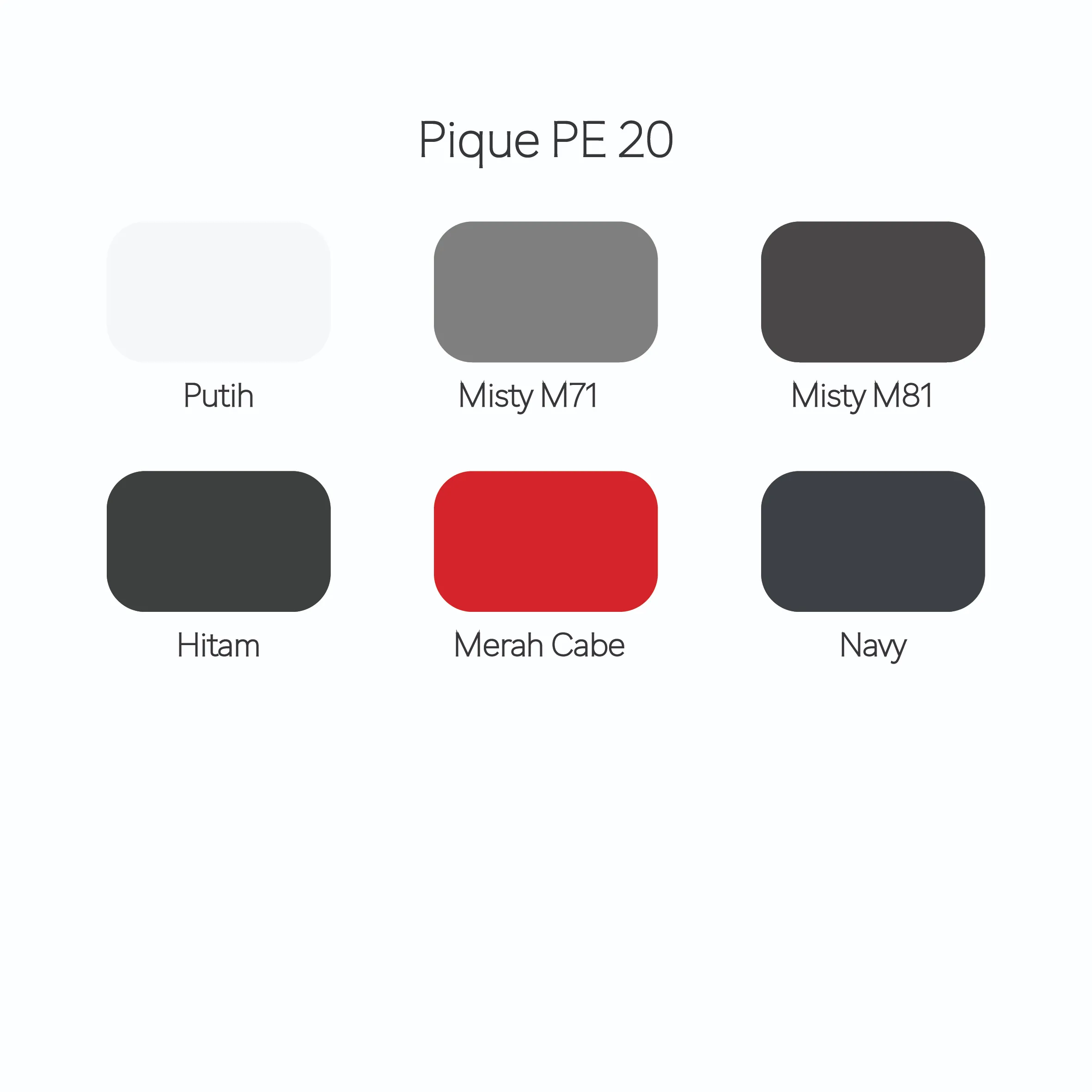 Kain Pique PE adalah bahan kaos berkerah yang ditenun menggunakan 100% serat sintetis Poliester (PE). Kain ini tetap mempertahankan tekstur rajutan khas pique yang berpori (motif sarang lebah / honeycomb) di bagian luarnya. Sementara itu, kode “20s” merujuk pada ukuran benang yang digunakan. Benang 20s adalah benang berukuran besar, sehingga menghasilkan kain yang tebal, padat, dan jatuhnya sangat tegap (tidak lemas/jatuh seperti kain tipis).